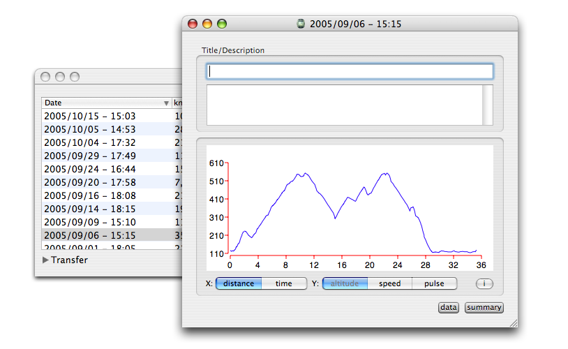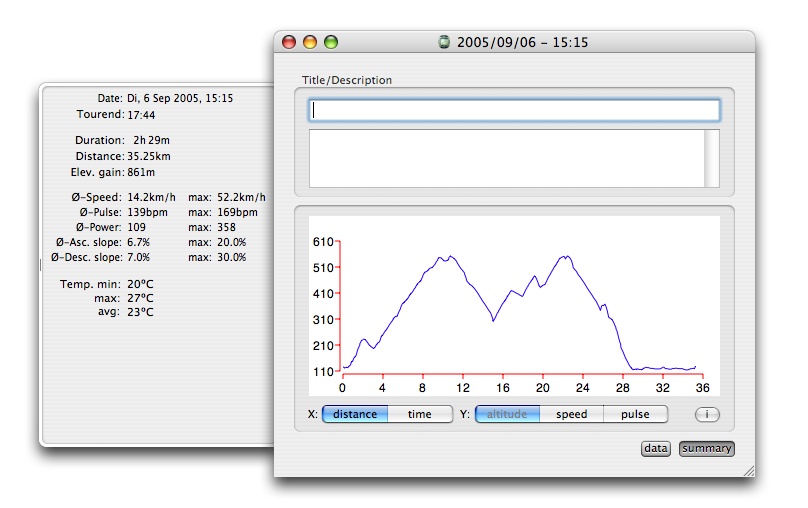 (fig. #3) is a more detailed view of your tour. You can enter a tour title, a description and investigate the tour using a larger chart. It is possible to choose from altitude, speed and pulse for the y-axis and select either distance or time for the x-axis.